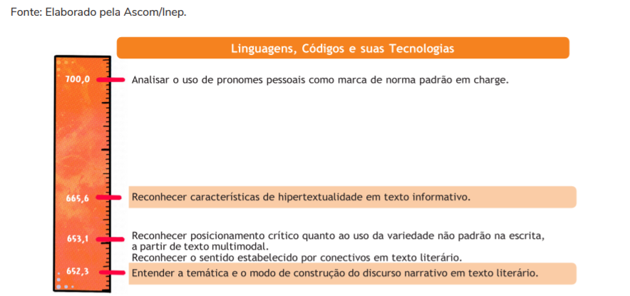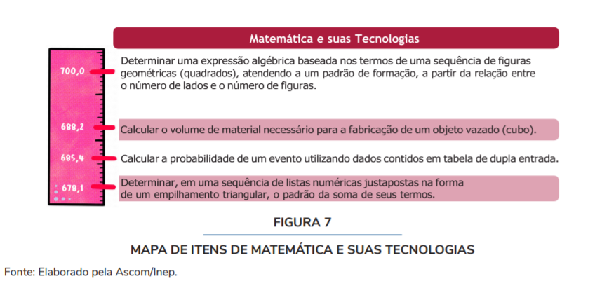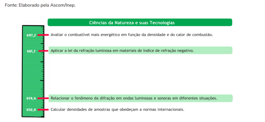 Nesse exame, só é possível atingir a nota máxima (1000 pontos) na avaliação da redação do participante, uma vez que os critérios de correção são outros. Para que os candidatos entendessem um pouco mais como o valor por questão é localizado na régua, o Inep elaborou um mapa por área do conhecimento. Veja parte dos mapas de cada área: