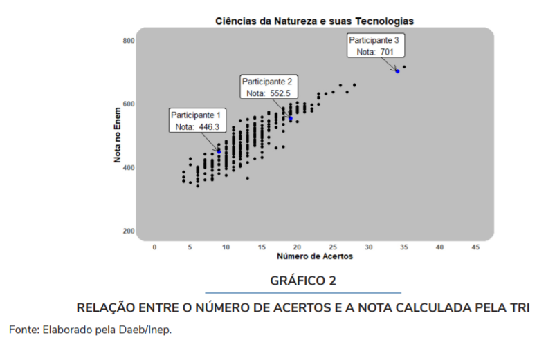 Os pontos no gráfico mostram que há pequenas variações de nota entre candidatos que obtiveram a mesma quantidade de acertos, entretanto perceba que cada um dos participantes (1, 2 e 3) se distancia no seu posicionamento por terem acertado mais ou menos itens. Você deve estar se perguntando: e qual a vantagem para o Enem utilizar esse sistema? Uma das vantagens é que podemos considerá-lo um modelo “antichute”, pois há um comparativo no desempenho do próprio aluno, resultando numa lógica de coerência entre as respostas, o que pode gerar um resultado diferente entre participantes com a mesma quantidade de acertos.