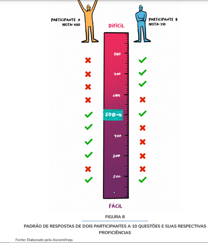 Agora pensando na pontuação do candidato com o desempenho comparado em todas as questões, caso ele acerte uma questão difícil, mas erre uma questão fácil que avalia habilidade semelhantes em níveis diferentes, ele ainda pontuará, porém não terá como resultado o valor máximo estabelecido na escala de proficiência para o item mais complexo. Por esse motivo, ficará com pontuação menor que um outro candidato que obteve a mesma quantidade de acertos e se sobressairá em relação aos outros estudantes que acertarem menos itens. Portanto, mesmo com esse tipo de correção Enem, sempre será melhor responder “chutando” a alternativa correta do que deixar a questão em branco.